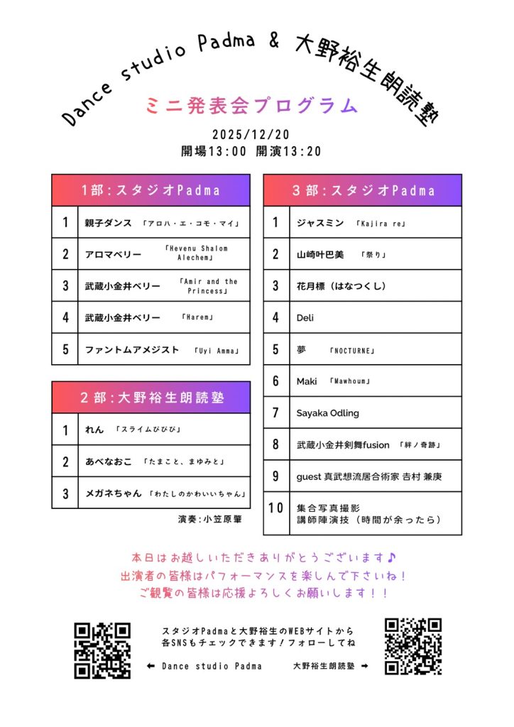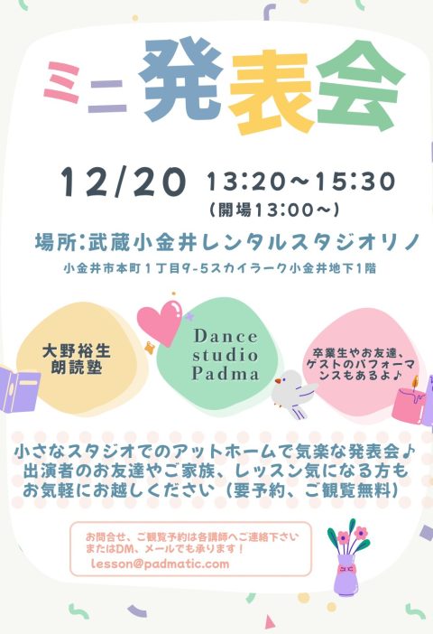 30名以上の方々が会を盛り上げて下さり、遠くから来てくださった方も多く、この日のために練習や準備をしてくださった方にも感謝感謝です。2025年の6月に、新天地の武蔵小金井でレッスン再開してから半年。このミニ発表会を無事に開催できたことで、この一年の頑張りを自分でも実感することができました。