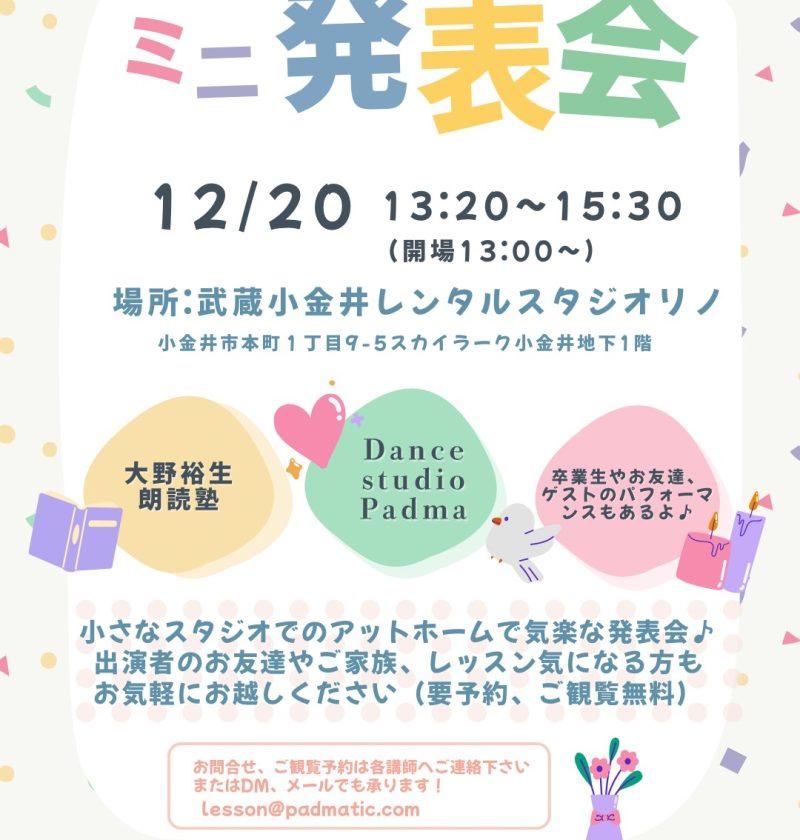 お知らせ 過去のイベント2025スタジオミニ発表会ギャラリー2026年1月5日2026年1月5日 2025/12/20 ご参加くださった皆様本当にありがとうございました💗 30名以上の方々が会を盛り上げて下さ …