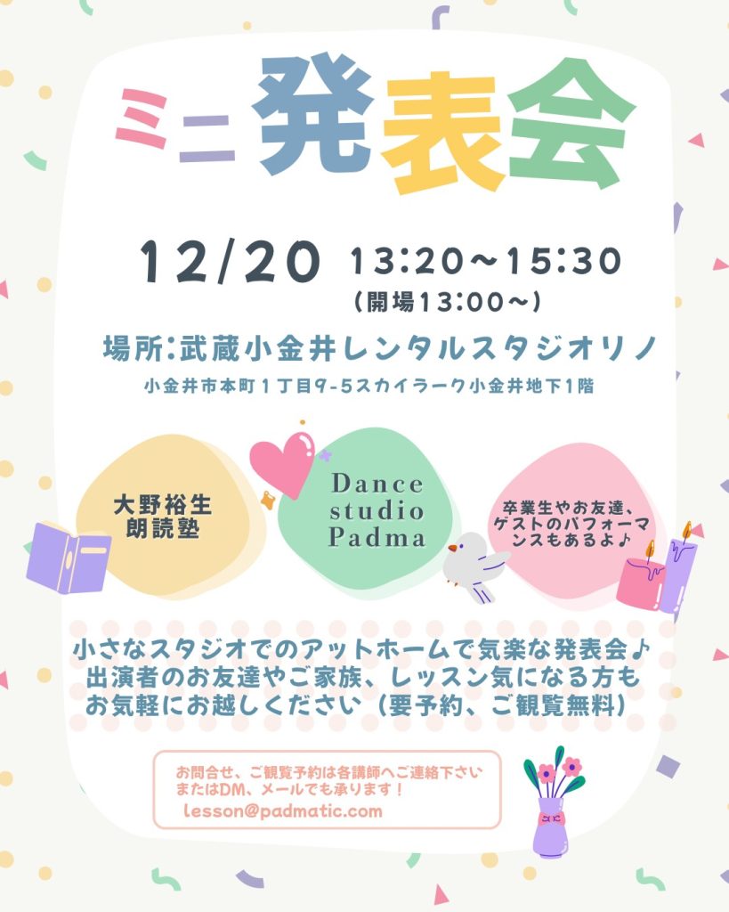出演者募集は定員に達しましたので終了しました。 教室の再オープン記念にミニ発表会を行います♪ 武蔵小金井スタジ …